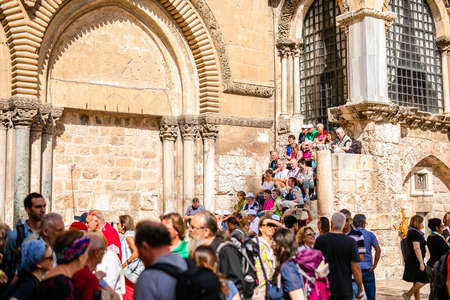 JERUSALEM, ISRAEL. 24 October 2018: pilgrims pray on their knees before the Altar erected over the place of the crucifixion of Jesus Christ in Church of the Holy Sepulchre