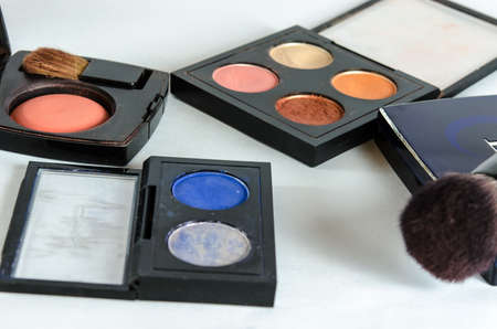 Close up picture of make up products and accessories, contour palette, brushes on white background