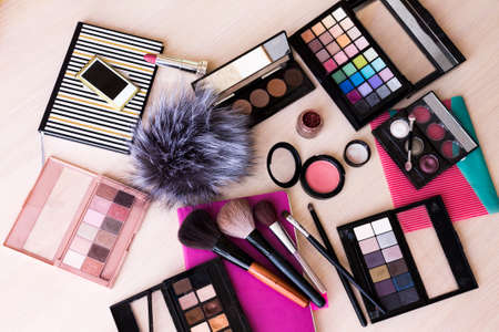 Makeup and makeup brushes on the table. Eye shadow, lipstick, gloss, mascara. Materials and tools for makeup. Beauty and fashion