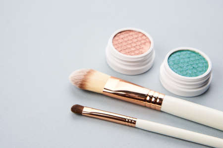 makeup brushes eyeshadow collection professional cosmetics on gray background