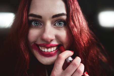 Portrait of crazy-looking teen girl with red hair she is smearing red lipstick on her face, horror concept. halloween time. Fear and nightmare