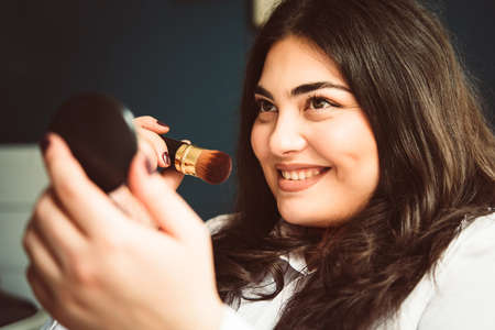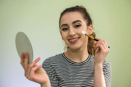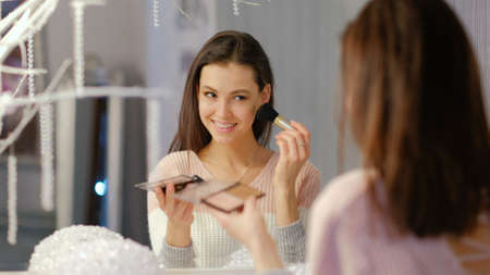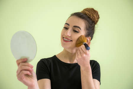 A pretty young lady using a cosmetic brush to apply decorative makeup on her face and looks in the mirror.