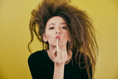 girl with a strange hair style paints her lips red lipstick
