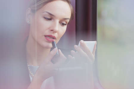 Pretty young businesswoman improving her make up during way on the meeting