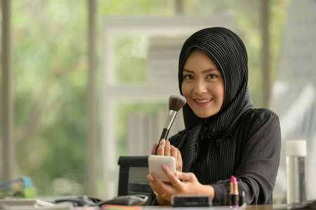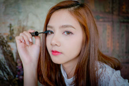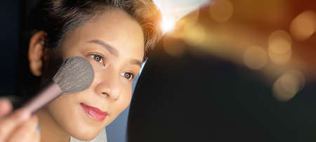 Asia Woman sitting by the mirror and applying makeup.refreshing her looks.