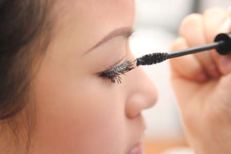 Asian woman is wearing makeup by the makeup artist.