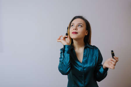 portrait of beautiful young woman holding make-up brush for makeup morning before work. concept of beauty and health