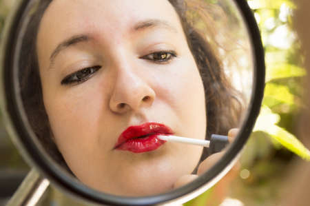 Woman applying lipstick in the mirror of a motorcycle with focus on the lips