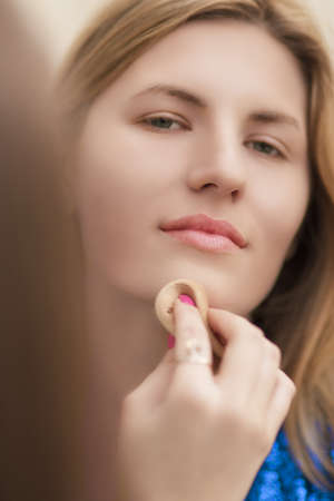 closeup of young smiling blond woman doing makeup using tampon and looking appear. focus on chin