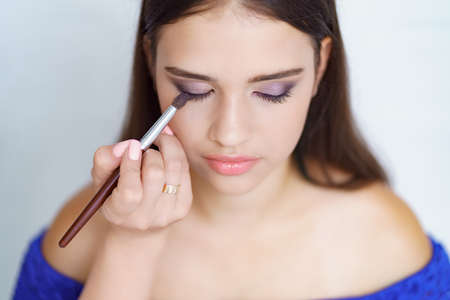 Woman who apply eyeshadow. Compose. Compose. Eyeshadow. Brush for eyeshadow. Makeup close-up space for text