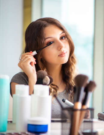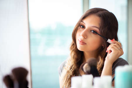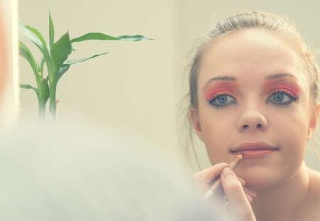 Young beautiful woman applying her make-up, looking in a mirror. Toned picture