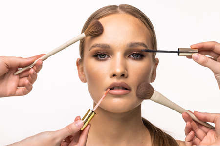 Portrait of young woman on white background with a perfect face with many hands holding makeup brush, eyeliner pencil and lipstick Isolated on white background