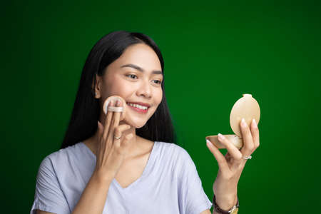 Young beautiful woman doing itself makeover isolated on green.