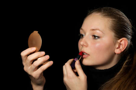 The girl does a make-up before a mirror. On a black background