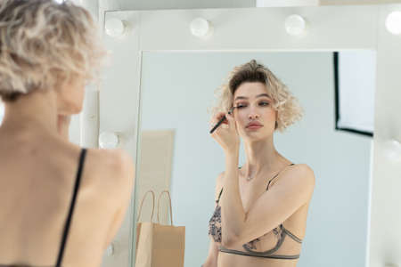 young beautiful woman stands in front of the mirror in lingerie makes make-up