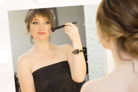 beauty makeup tutorial. vogue glamour fashion lifestyle. young beautiful girl applying blush in front of the mirror