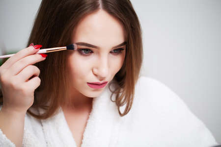Young beautiful woman in terry white dressing gown makes herself beautiful makeup at home. Model holds makeup brush and cosmetics in her hands. Cozy home.