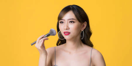 Young Woman Making Makeup Using Cosmetic Brush Posing On yellow Background