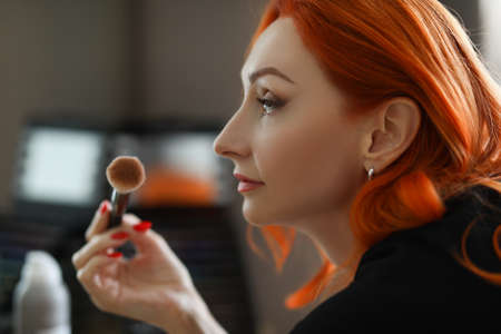 Portrait of sexy smiling happy caucasian young woman applying foundation blusher with makeup brush