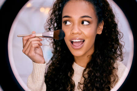 Happy smiling elegant woman or beauty blogger with brush on recording video while review product make up tutorial for theme about video blogging on camera screen.
