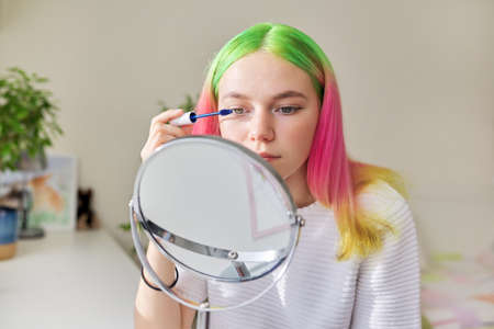 Cosmetics and makeup for teenagers, fashionable girl with colored dyed hair dyeing eyelashes with mascara looking in the makeup mirror at home near the window
