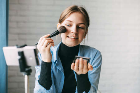 A teenage girl does makeup and records video for her blog on a smartphone on a tripod at home. Communication of a video blogger girl on social networks with subscribers and friends