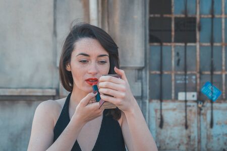 Beautiful young brunette with long hair putting on red lipstick in an industrial area