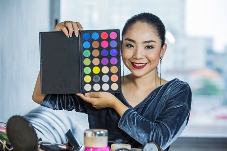 Asian young beauty cosmetic blogger woman use tablet for prepare information before record clip video about demonstrating make up techniques and informing customers about product detail at studio.