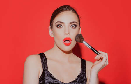 Portrait of amazed woman with makeup brush near face. Beautiful woman, female skin care, close up face beauty portrait.