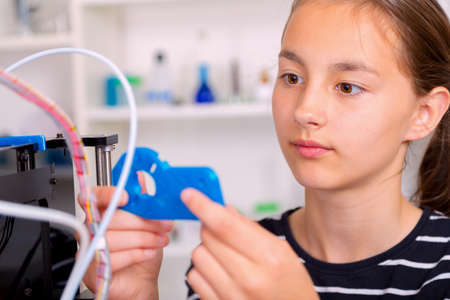 Schoolgirl with 3d printe. education, technology.