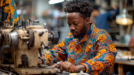 An African tailor meticulously works on a sewing machine in his workshop, dedicated to creating traditional clothing.