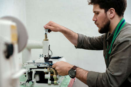 The workplace of a seamstress. The dressmaker works on a sewing machine. A tailor threads a thread into a sewing machine at his workplace. Hobby-sewing as a small business concept. High quality photo