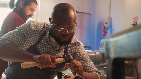 African american manufacturer shaping raw timber using chisel and hammer, creating wood art, making precise cuts. Artist making handmade wood sculptures, engraving lumber with tools, camera B close up