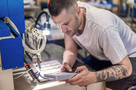 Professional worker machinist engineer technician tuning and programming computer console unit on soft PVC dispensing machine in factory production workplace. Industrial working operating process