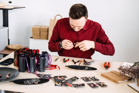 Male jewelry artisan meticulously crafting handmade accessories in a modern workspace. Handmade business, artisan craftsmanship, independent maker