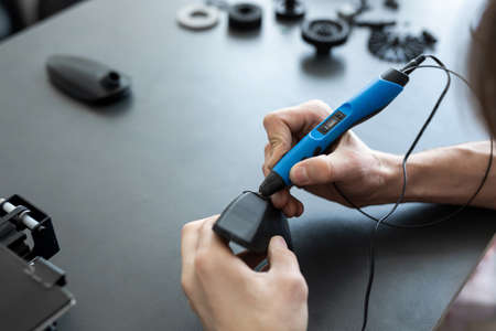 Man connects two 3D printer parts with a 3D pen.