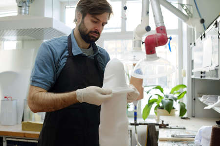 Young serious man in apron and gloves putting thermoplastic sheet all over prosthetic socket while working over one of clients orders