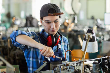 Content tomboy in cap wearing protective eyewear and ear protectors using pliers while repairing machine, she working at clock factory production
