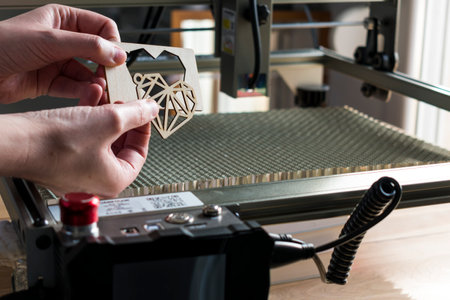 Laser engraving and cutting, woman holding an example of a cut out wooden heart