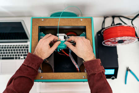 Stock photo of unrecognized technician fixing modern 3d printer.