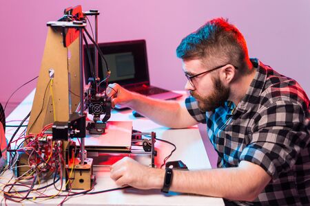 Technology and engineering concept - Male engineer working at night in the lab, he is adjusting a 3D printer components.