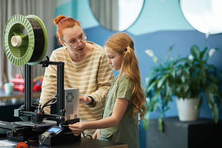 Portrait of female teacher helping cute girl using 3D printer during engineering and robotics class at modern school, copy space