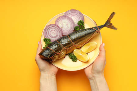 One appetizing cold-smoked mackerel lies on a yellow background.