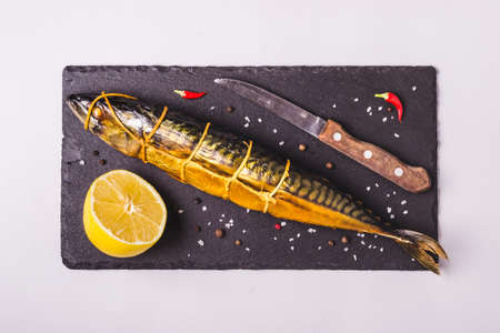 Smoked mackerel fish, knife and lemon on black stone cutting board on gray