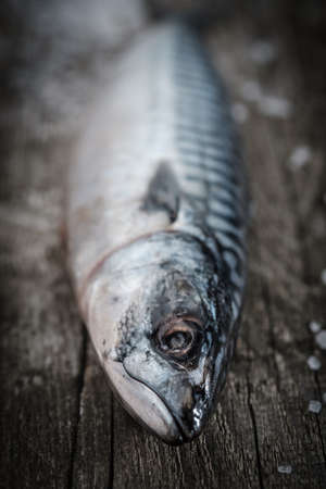 Fresh raw fish mackerel on a wooden table. Rustic style. Closeup.