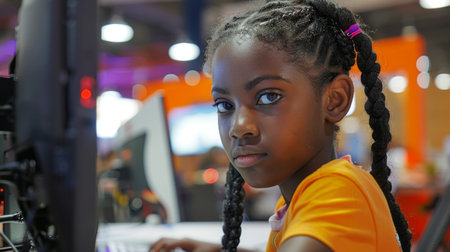 The close up picture of the hispanic girl participating in robotics or mechanic competition, robotics competition require robotics knowledge and skills, focus and concentration, adaptability . AIG43.