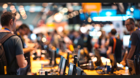 People are navigating a bustling convention hall with dynamic motion blur, creating a sense of activity and movement throughout the crowded trade show or public event