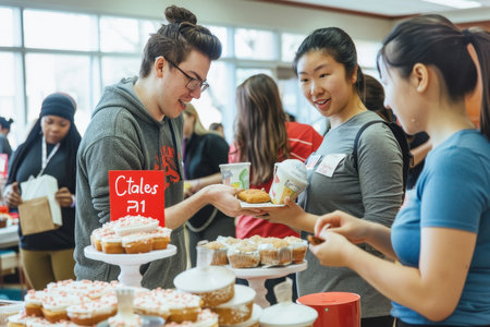 Diverse students enjoying a campus bake sale gathering.