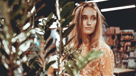 Young woman buying flowers in a pot at a garden center
