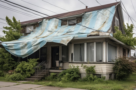 tarp covering a storm-damaged roof for protection, created with generative ai